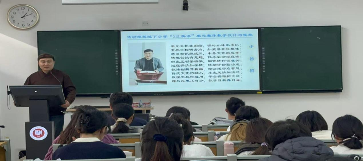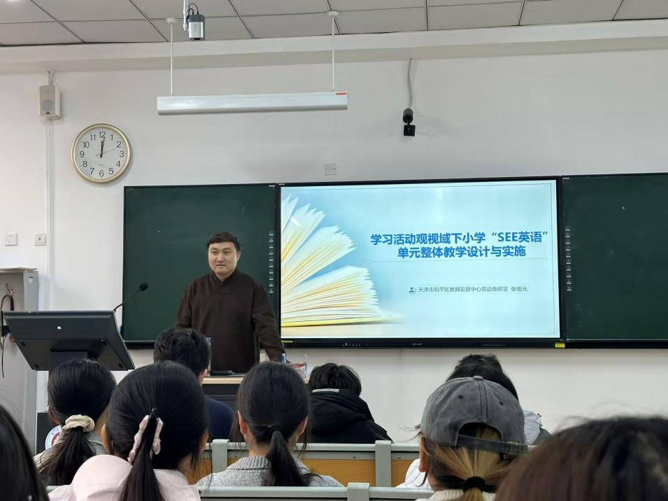 日前,教育学部本科生教学能力提升系列微课程讲座第二期——“学习活动观视域下小学‘SEE英语’单元整体教学设计与实施”成功举办。本次活动特邀天津市和平区教师发展中心英语教研室教研员、党支部书记张祖光担任主讲,学部小学教育专业本科生代表60余人参加。