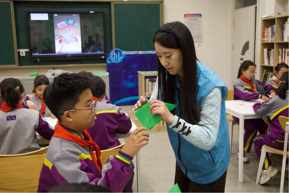 大学生和小学生一起动手折叠雷锋帽