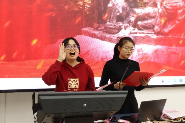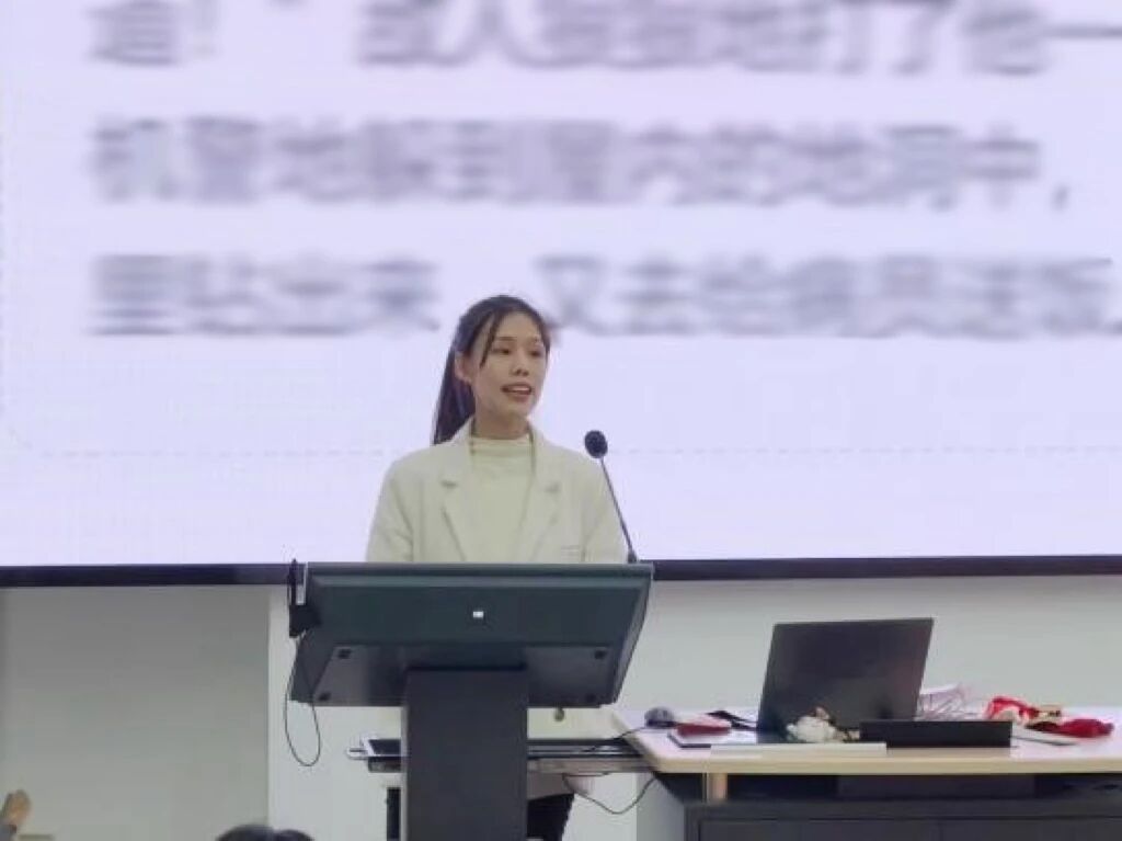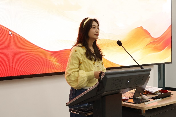 宣讲过程中,宣讲团特别设置了朗诵和快板环节。宣讲团成员王颖和高嘉带来的朗诵《沂蒙花开》,情感真挚,语调激昂,她们用声音再现历史,深情演绎着沂蒙红嫂月芬、春英等人在战争中的坚韧与奉献。“可历史不会忘记,人民不会忘记。请允许我,请允许我们,这样,这样称赞,你们这些无名英雄!”深情的朗诵仿佛将听众带回了那段艰苦卓绝的岁月,深深触动着现场每一位听众的心灵,许多同学不禁热泪盈眶。