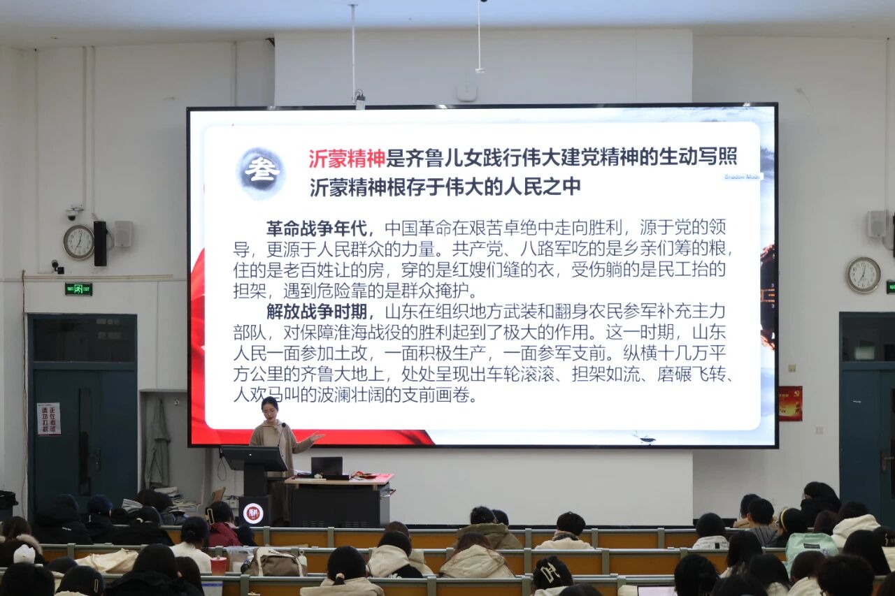 宣讲团成员以“弘扬沂蒙精神,传承红色基因”为主题,分别从“沂蒙精神的基本内涵”“沂蒙精神是齐鲁儿女践行伟大建党精神的生动写照”“新时代大力弘扬沂蒙精神”三个篇章,用接地气、有活力、有温度的语言,全方位呈现了沂蒙浓浓的红色基因和厚重的时代价值,深刻阐述了“党群同心、军民情深、水乳交融、生死与共”的伟大沂蒙精神。那一个个感人至深的红色故事,一幕幕震撼人心的历史画面,在宣讲团的生动讲述下,仿佛穿越时空,鲜活地呈现在众人眼前,深深打动了在场的每一位师生。