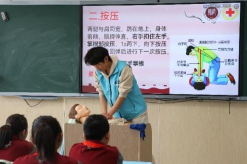 生命无价,急救分秒必争。讲解员通过图文并茂的PPT、生动视频、趣味动画以及现场演示等形式,向中小学生讲解自动体外除颤器——AED的使用方法以及心肺复苏、人工呼吸等基本急救技能,讲解内容丰富有趣、贴近生活实际。宣讲后,讲解员邀请中学生亲身体验急救操作,在实践中巩固所学技能,提升个人应急能力、培养社会责任感和互助精神。